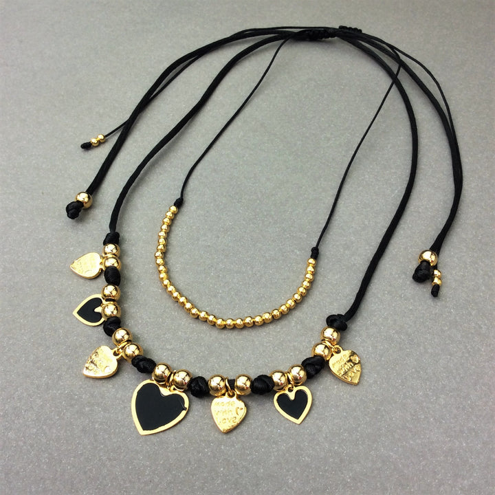 Collar 2, Gargantilla o collar largo en cordón italiano, dijes de corazón grabados y de resina, nudo graduable.