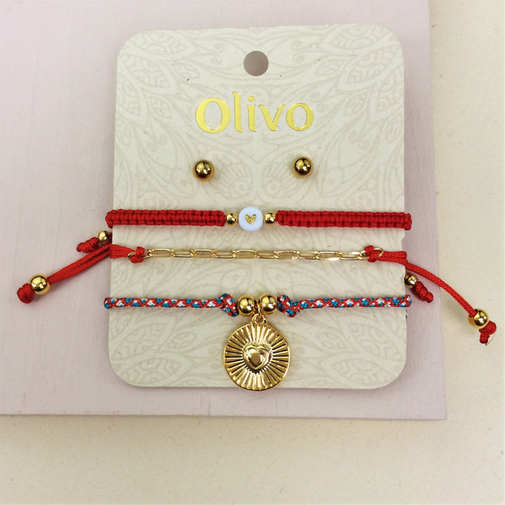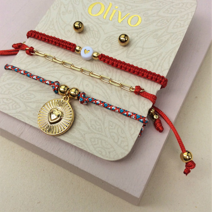 Pulsera 3, cordón entrelazado grueso con balines y dije en placa corazón, nudo graduable.